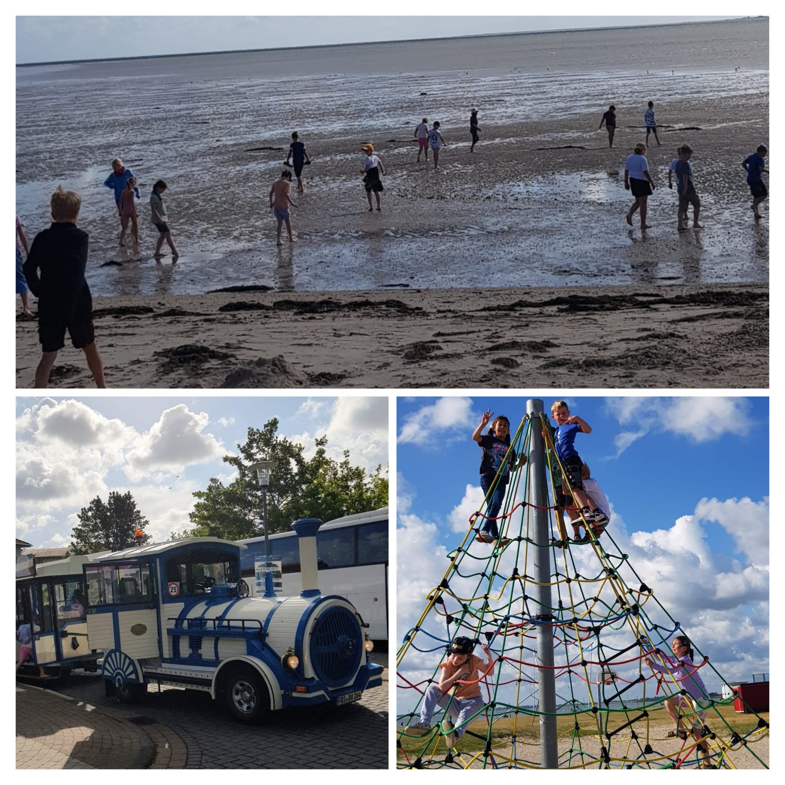 Am Dienstag, den 27.6.2023 haben die beiden zweiten Klassen einen gemeinsamen Ausflug an den Strand von Schillig unternommen. Dazu wurden die Kinder mit dem Watt’n Express, der blau-weißen Bimmelbahn, die normalerweise zwischen Horumersiel und Schillig unterwegs ist, am ZOB abgeholt. Die Fahrt ging durch die Natur vorbei am Deich bis zum Horumersieler Hafen und endete mit einem ersten Blick auf das Wattenmeer schließlich am Schilliger Strand. Sofort wurde von den Kindern der Spielplatz in Beschlag genommen und Schaukeln, Rutschen und Klettergerüste ausprobiert. Zwischendurch konnten sich die Kinder an ihrem mitgebrachten Frühstück und Getränken stärken, allerdings mussten sie sich dabei vor den Möwen in Acht nehmen, die schon über den Köpfen kreisten. Mitarbeiter des Strandes warnten die Kinder noch mal ausdrücklich davor, die Möwen zu füttern, da die Tiere menschliche Nahrung häufig nicht vertragen. Viel Spaß machte den Kindern der Gang zum Strand. Alle durften die Schuhe ausziehen, ins Watt laufen und nach Fundstücken wie Muschelschalen und Schneckenhäuser suchen. Zurück auf den Spielplatz zog sich die letzte Stunde dann doch etwas hin, zumal der Wind ziemlich stark blies. Schließlich kam die Bahn zurück und brachte die Kinder auf kurzer Strecke zurück nach Hooksiel. Wir danken dem Gewerbeverein Horumersiel-Schillig, dass er uns diese tolle Fahrt ermöglicht hat.
