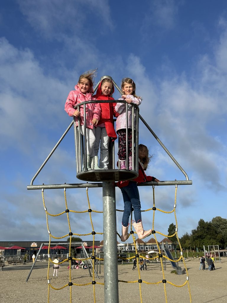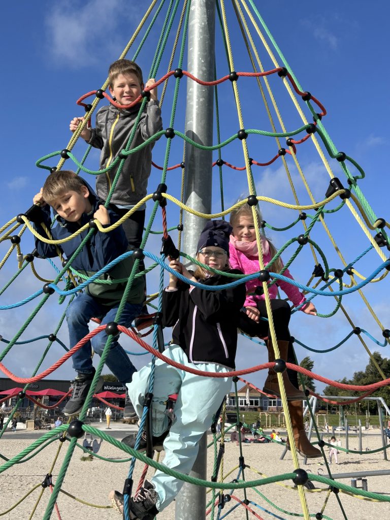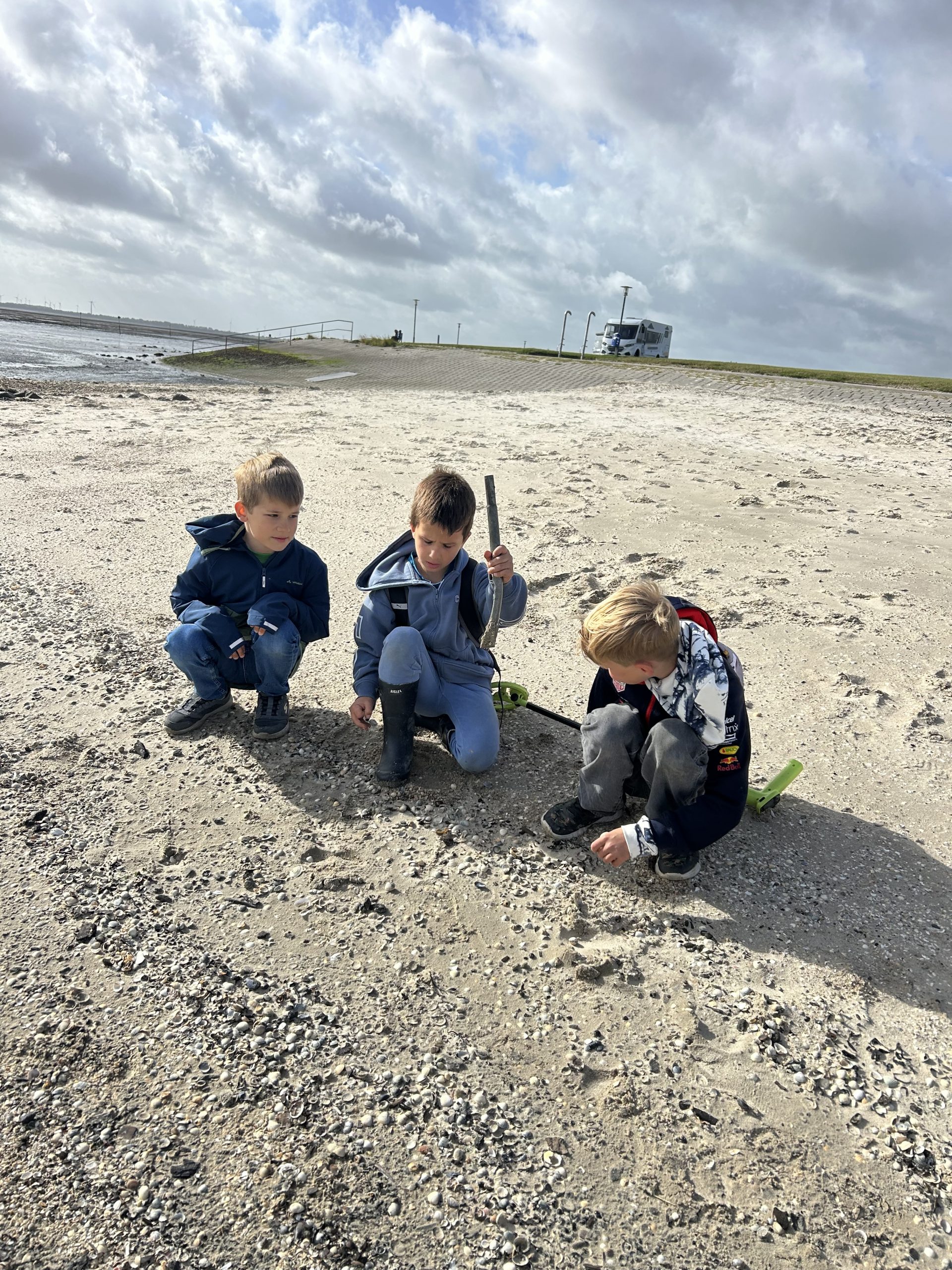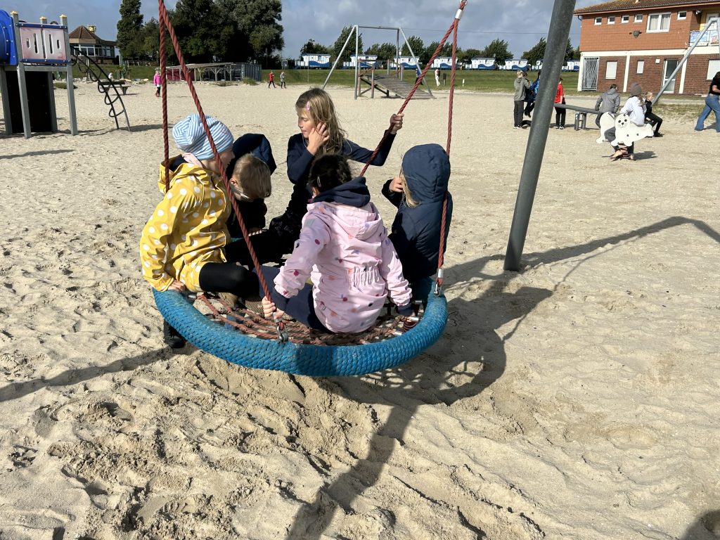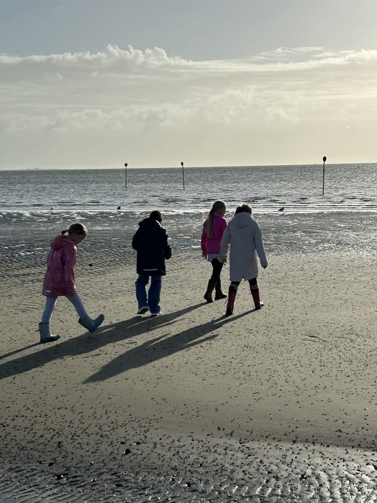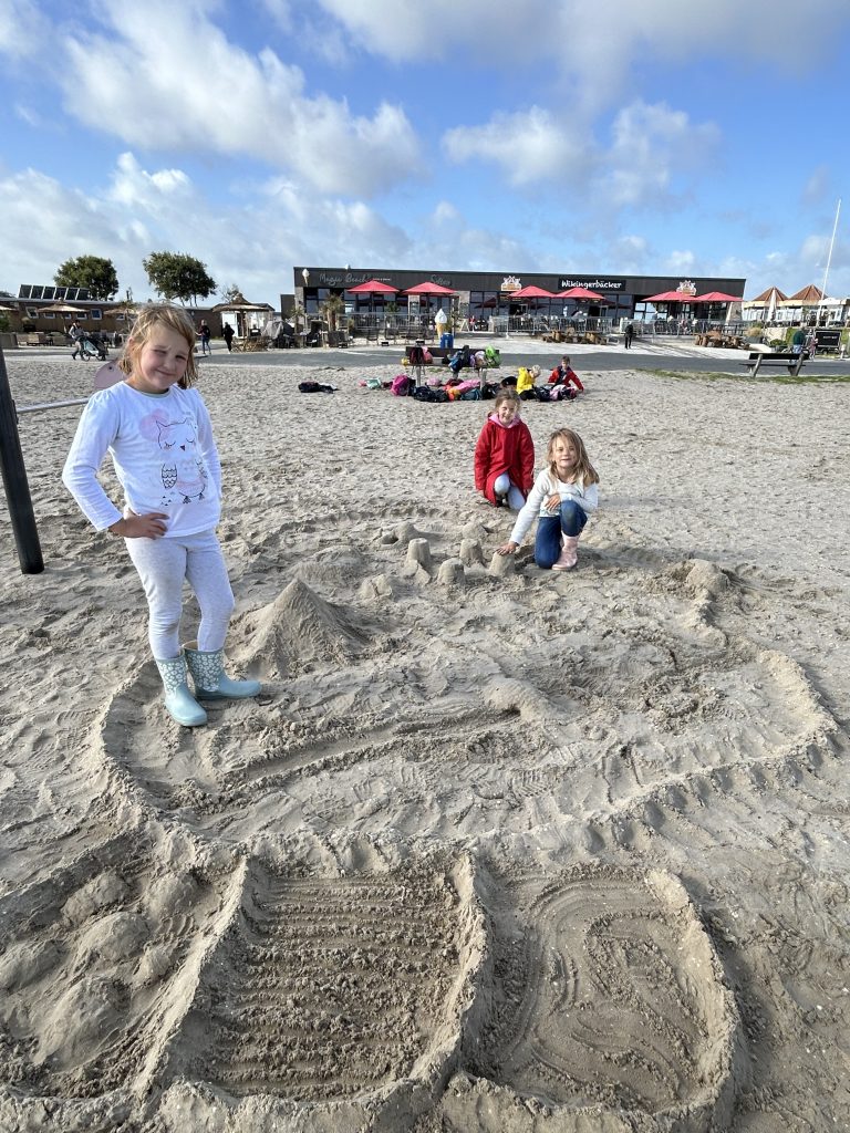 Nach einer 35-minütigen Fahrt mit der Bahn stiegen wir am Strand in Schillig aus. Dort konnten die Kinder in kleinen Gruppen bis ins Watt laufen oder auf dem Spielplatz spielen. Besonders spannend war, dass Toni mit einem Metalldetektor nach Schätzen suchte – gefunden hat er zwar nur alte Dinge, aber die Kinder hatten großen Spaß dabei. Einige Kinder bauten zudem im Sand ein richtiges ägyptisches Dorf mit Pyramiden, angelehnt an das Thema Mose, das beide Klassen derzeit im Religionsunterricht behandeln.