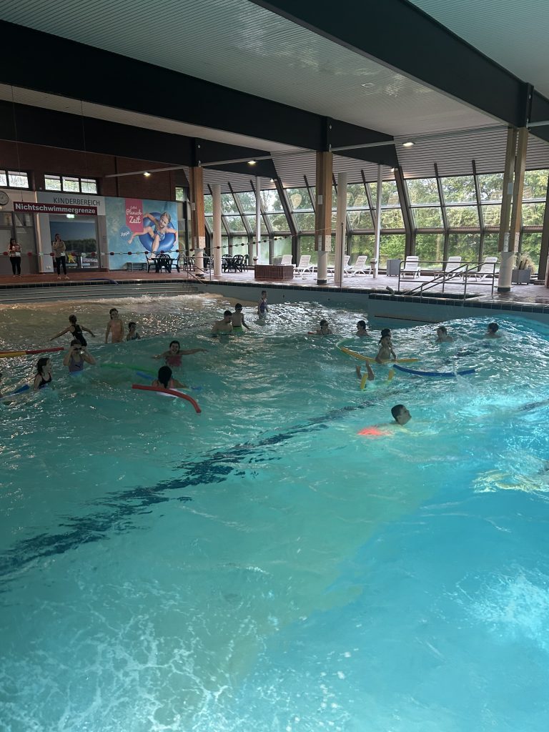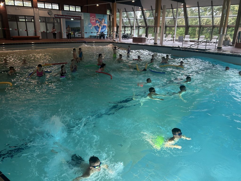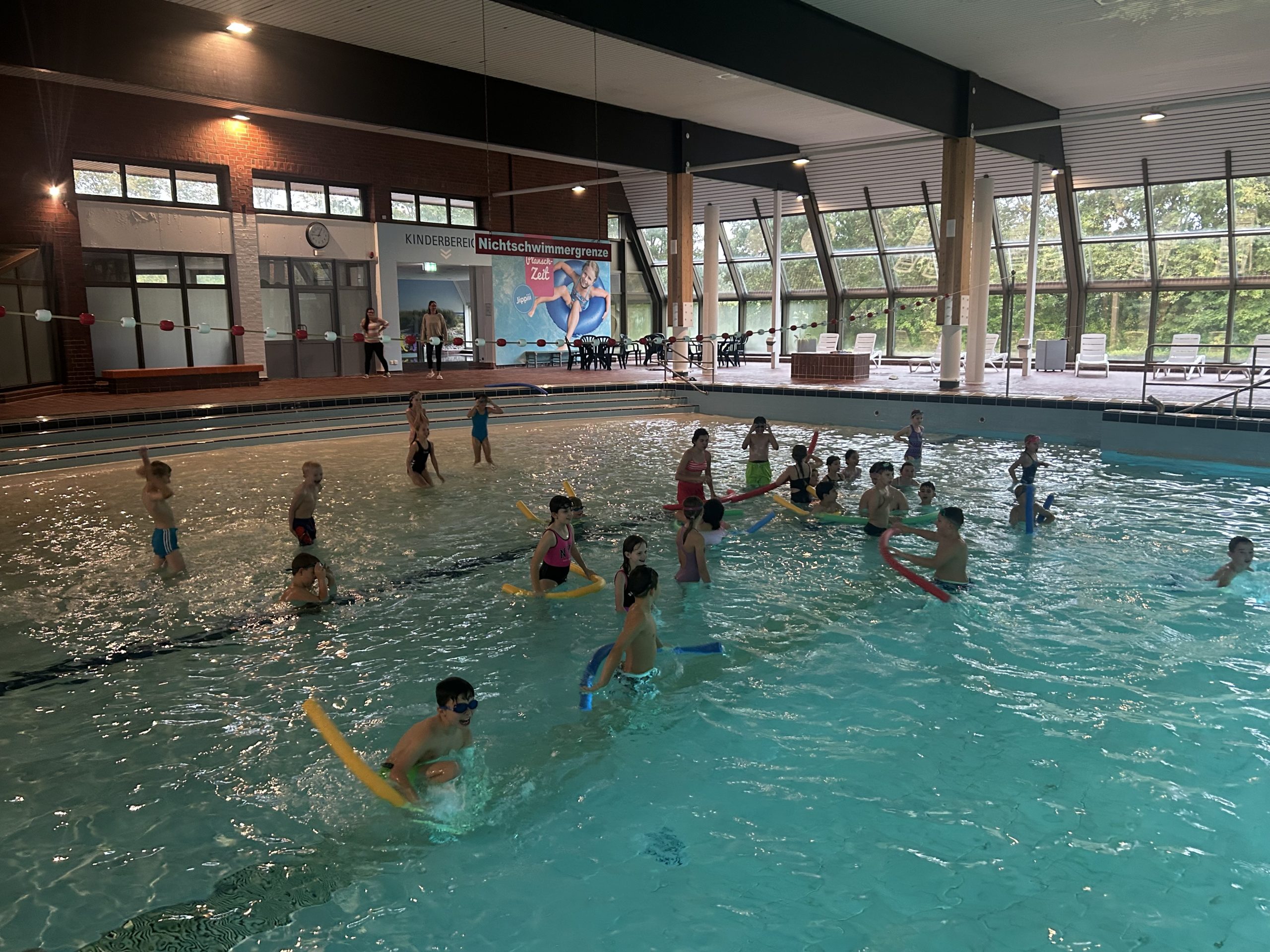 Die beiden vierten Klassen der Grundschule Hooksiel mit ihren Lehrkräften Herrn Alker und Frau Giersdorf waren heute voraussichtlich zum letzten Mal zum Schulschwimmen im Hallenwellenbad Hooksiel. Da das Bad am 15. Oktober aus den bekannten Gründen geschlossen wird, kann der Schwimmunterricht dort künftig leider nicht mehr stattfinden. Die Schulleitung bemüht sich derzeit intensiv, einen neuen Ort für den Schwimmunterricht zu finden – was sich jedoch als große Herausforderung erweist. Die Kinder genossen den letzten Besuch im Hallenwellenbad in vollen Zügen: Sie durften noch einmal in den Wellen planschen, ihre Schwimmabzeichen ablegen und ein paar fröhliche Momente erleben. So wurde der Abschied von unserem beliebten Bad, das über viele Jahrzehnte fester Bestandteil des Schullebens war, zu einem besonderen Erlebnis. Ein herzliches Dankeschön geht an das gesamte Team des Hallenwellenbades Hooksiel für die jahrelange gute Zusammenarbeit und die freundliche Unterstützung bei unzähligen Schwimmstunden unserer Grundschüler- und Grundschülerinnen.